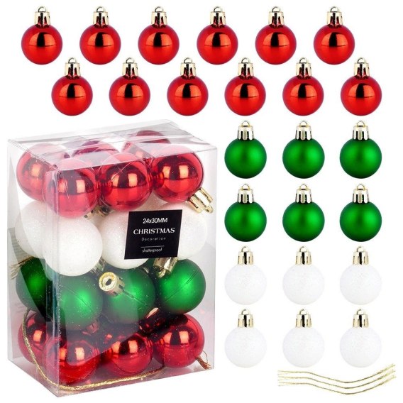 Zestaw 24 sztuk nietłukących bombek. W zestawie: 12x czerwone bombki błyszczące, 6x zielone bombki matowe, 6x białe bombki brokatowe. Bombki prezentują się bardzo efektownie. Niezbędne do dekoracji choinek, kompozycji świątecznych i stroików. Będą stanowić wyjątkową ozdobę na choince. Z ich pomocą możemy w modnym stylu ubrać swoje drzewko świąteczne.