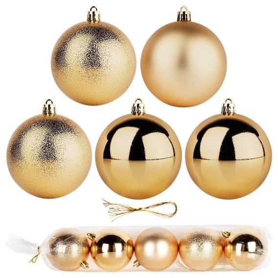 Zestaw 5 sztuk nietłukących bombek. W zestawie: 2x złote bombki błyszczące, 1x złote bombki matowe, 2x złote bombki strukturalne. Bombki prezentują się bardzo efektownie. Niezbędne do dekoracji choinek, kompozycji świątecznych i stroików. Będą stanowić wyjątkową ozdobę na choince. Z ich pomocą możemy w modnym stylu ubrać swoje drzewko świąteczne.