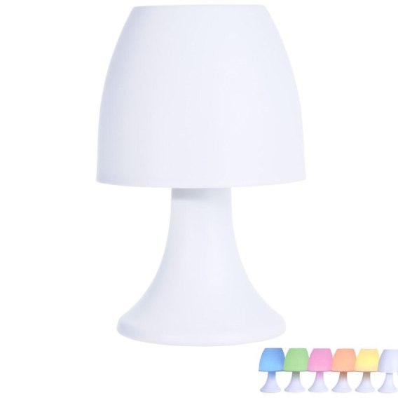 Lampka stołowa LED o wysokości 19 cm i średnicy 12 cm. Wykonana z lekkiego tworzywa w kolorze białym. Sprawdzi się zarówno w salonie, sypialni, jak również w pokoju dziecięcym. Dzięki niej dziecko będzie mogło zasypiać czy świetle. Posiada dwie funkcje świecenia - na biały kolor oraz w trybie wielokolorowym. Zasilanie 3x bateria AAA 1,5V (brak w zestawie). Wyprodukowano zgodnie z europejskimi standardami.