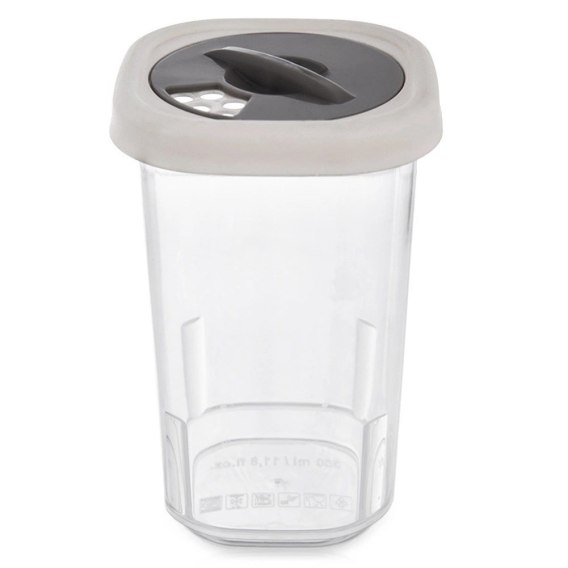 Zamykany pojemnik na przyprawy. Wygodne dozowanie zapewnią otwory, które pozwolą uniknąć dodania zbyt dużej ilości przypraw. Dzięki pokrywce przyprawy dłużej pozostaną świeże. Dozowanie przypraw z pojemnika jest dużo wygodniejsze niż bezpośrednio z torebki.