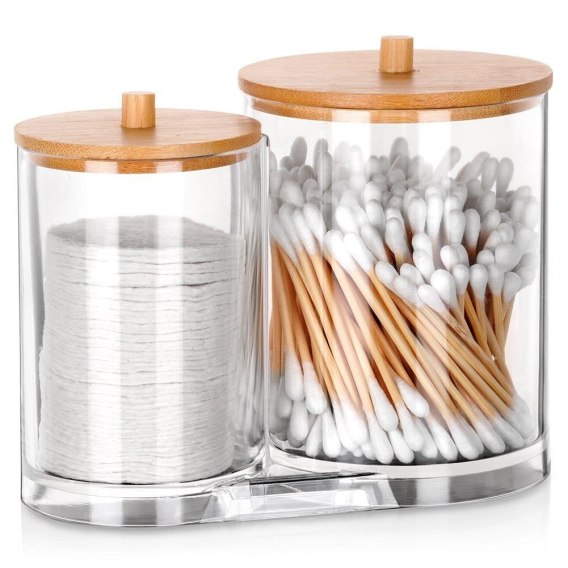 Zestaw dwóch pojemników na patyczki lub płatki kosmetyczne to praktyczny dodatek do łazienki. Przezroczysty kolor pozwoli zobaczyć, ile patyczków lub płatków zostało. Zestaw wyróżnia się nowoczesnym, prostym wzornictwem, które doskonale wpasowuje się w wystrój każdej łazienki.