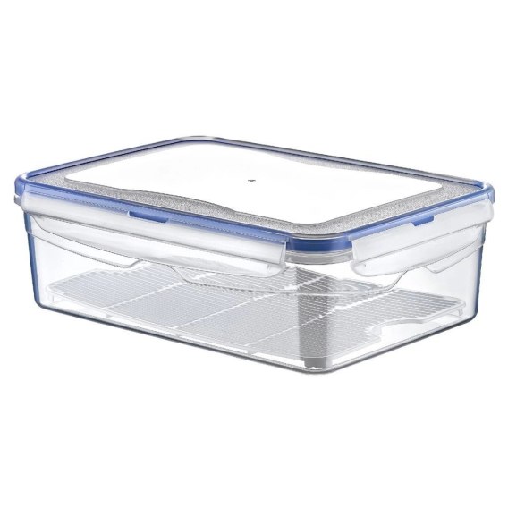 Pojemnik na żywność z kratką i uszczelką, idealny do przechowywania, podgrzewania i transportowania różnych produktów. Posiada pokrywkę z uszczelką, która zapewnia szczelność i chroni przechowywane przedmioty przed wilgocią, powietrzem oraz innymi czynnikami zewnętrznymi. Dodatkowo, specjalna wyjmowana kratka pomaga utrzymać świeżość i zapobiega zbieraniu wilgoci, co mogłoby przyspieszyć proces psucia się żywności. Pojemnik świetnie sprawdzi się do przechowywania produktów takich jak wędliny czy sery.