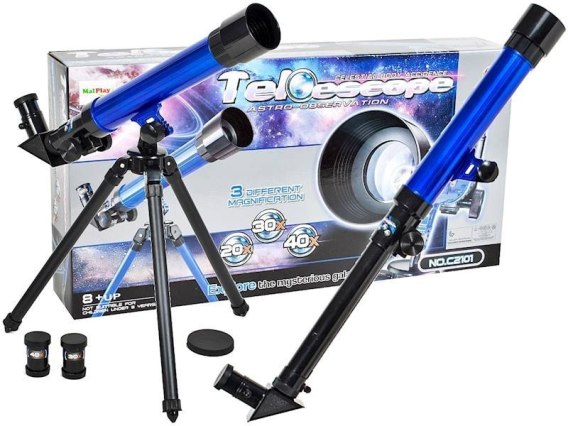 Teleskop edukacyjny dla dzieci do pierwszej nauki astronomii. Zestaw zawiera lunetę oraz 3 szkła przybliżające x20, x30, x40