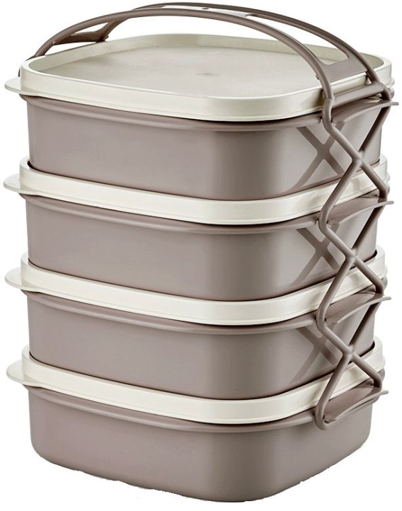 Prezentowany przedmiot składa się z 4 pojemników  o pojemności 1 l  . Każda komora posiada osobne zamknięcie. Wszystkie elementy łączą się za pomocą bezpiecznych zatrzasków. Można je bez obaw transportować razem, jeden na drugim. Praktyczna, długa rączka pomaga w wygodnym chwytaniu.