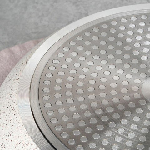 ⭐ Aluminiowa patelnia o średnicy 28 cm - Patelnia do smażenia oraz duszenia o średnicy 28 cm. Wymiary zewnętrzne: długość 48 cm, wysokość patelni 5,5 cm, wysokość z rączką 7,5 cm. Wykonana z odlewu aluminium. Patelnia jest w kolorze kremowym z nakrapianą powierzchnią.
