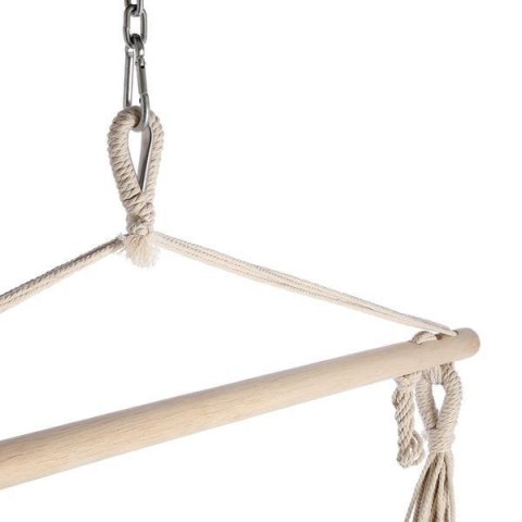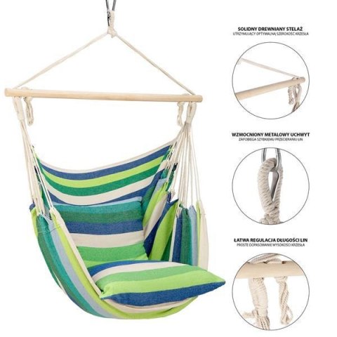 Tego typu krzesła, nieznacznie przypominają hamak, jednak są dużo prostsze w montażu. Wynika to z faktu, że wieszamy je za jeden uchwyt. Daje to możliwość, montażu w domu, na balkonie, w ogrodzie lub nawet, zabranie naszego ulubionego fotela na camping. Będą również alternatywą, gdy nie ma aż tyle miejsca, by powiesić hamak. Wzmocniony, stalowy uchwyt, pozwoli długo i bezpiecznie użytkować krzesło.
