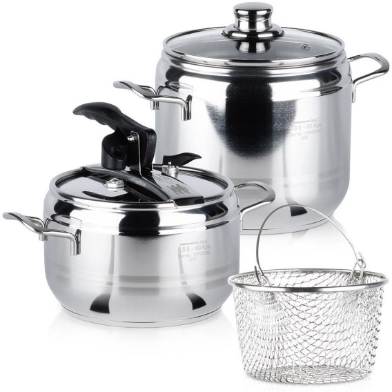Komplet składający się z dwóch szybkowarów, jednej pokrywki szybkowarowej, jednej pokrywki szklanej oraz koszyka. Podana pojemność szybkowarów dotyczy pojemności całkowitej naczynia. Pojemność szybkowarowa to 2/3 pojemności całkowitej. Wymiar mniejszego szybkowaru wynosi 13 x 19,5 cm, większy szybkowar ma wymiary 17 x 23 cm. Średnica każdego z garnków wynosi 22 cm. Z jego pomocą będziemy mogli przygotować pyszne potrawy w znacznie krótszym czasie. Szybkowar jest łatwy w obsłudze i bezpieczny.