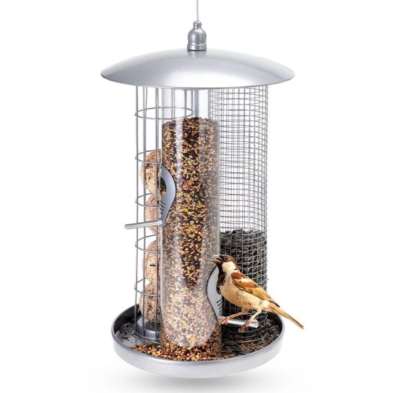 Karmnik dla ptaków w którym umieścimy karmę, ziarno oraz kule tłuszczowe. Karmnik możemy zamontować w ogrodzie, na tarasie lub balkonie. Dzięki odpowiedniej formie możemy w wygodny sposób kontrolować ilość umieszczonej w nim karmy. Prezentuje się bardzo efektownie, więc będzie dekoracją zarówno w ogrodzie, jak również na balkonie, czy tarasie.