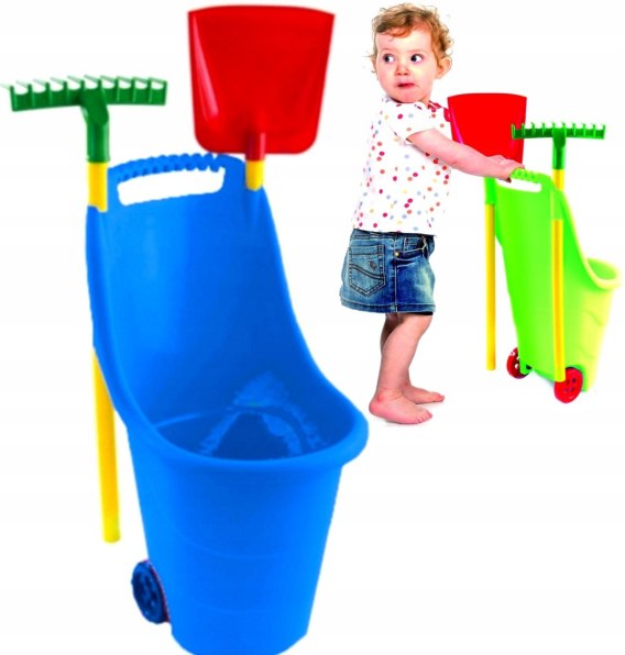 - Zestaw zawiera: taczkę z rączką, łopatę i grabie