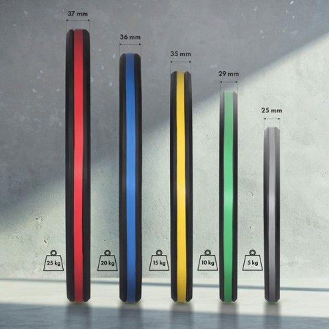 Talerze TOG zostały wykonane z połączenia solidnej stali i najwyższej jakości gumy virgin rubber, która cechuje się wyjątkową trwałością i odpornością na zużycie. Virgin rubber, jako materiał pierwotny, jest wolny od zanieczyszczeń, co sprawia, że talerze są bardziej wytrzymałe i bezpieczne dla podłogi. Dodatkowo guma minimalizuje hałas i amortyzuje uderzenia, co czyni je idealnym rozwiązaniem w każdej przestrzeni treningowej.